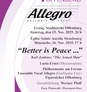 Concert franco-allemand : « Better is Peace » (Mieux vaut la Paix) Tel est le thème du concert qui vous est proposé par l’Ensemble Vocal Allegro de Strasbourg (dirigé par Guillaume Frey) et le Figuralchor d’Offenburg, placés sous la direction de Werner Continuer la lecture Allegro en concert→